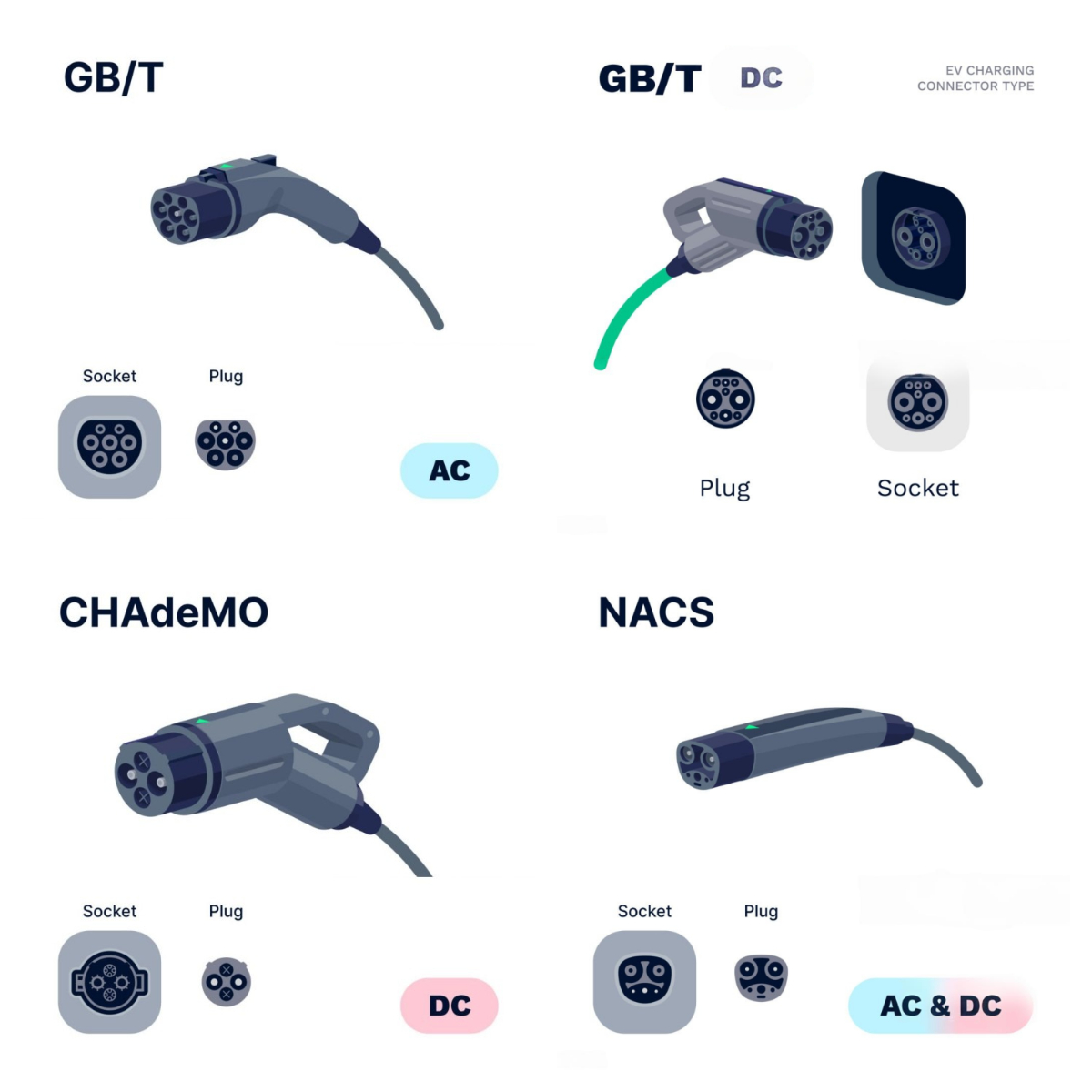 EV charging guns follow different standards depending on the region. Here’s how they vary by country: